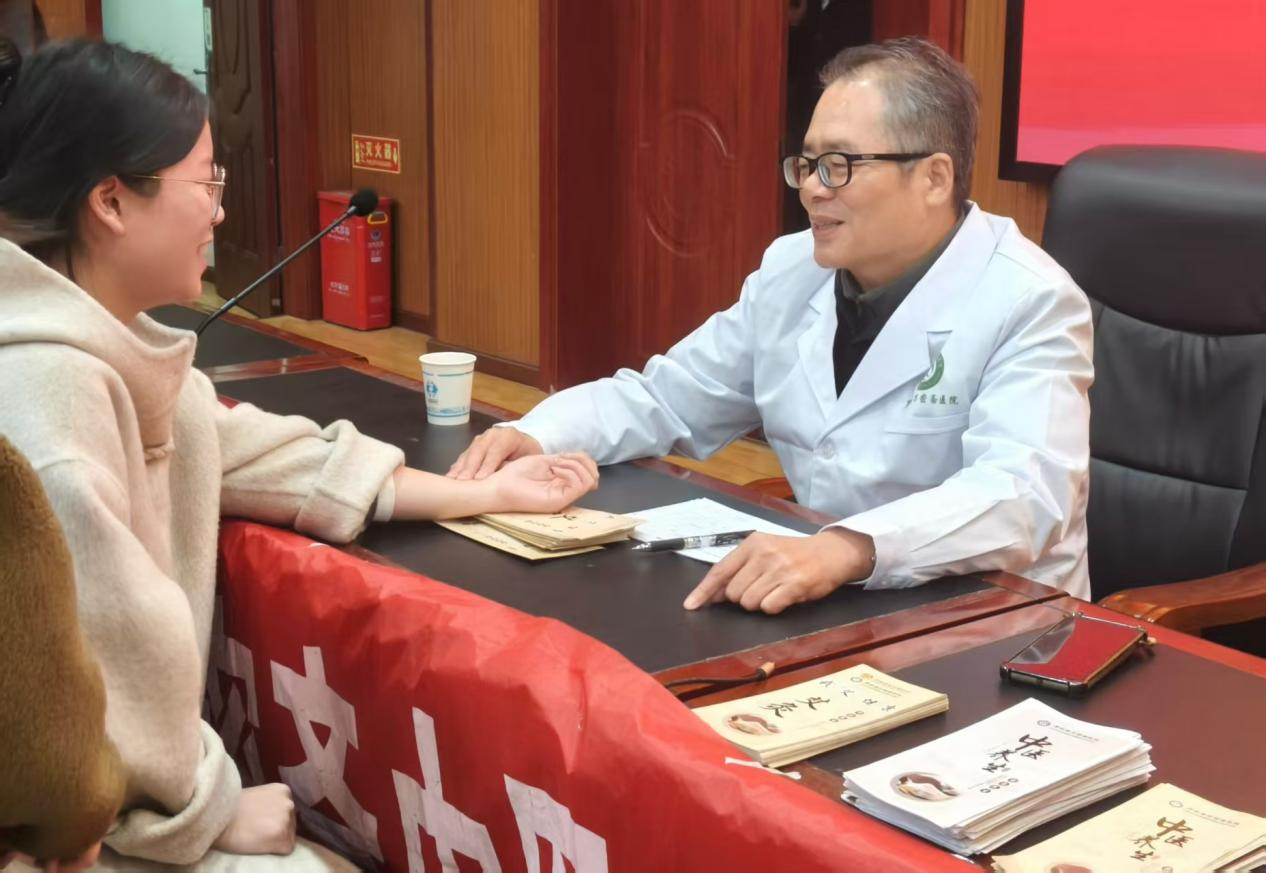 活动伊始,雷威院长开展专题授课,从万密斋生平事迹、医学成就、精神传承及医院发展四个维度,系统讲述了中医药文化的传承脉络。同时,结合医院发展实践,雷院长也展示了万密斋医学思想的当代传承成果。理论宣讲结束后,中医适宜技术体验环节拉开帷幕。在把脉问诊区,医院主治医师邱峰朝的诊桌前很快排起长队。作为中医诊断的核心技术,脉诊被称为“中医的听诊器”,邱峰朝凭借多年临床经验,为学员们提供专业诊疗服务。他端坐椅上,指尖轻搭学员腕部,凝神感受脉象的浮沉、迟数、强弱变化,同时结合望舌象、问症状,全面判断体质状况。