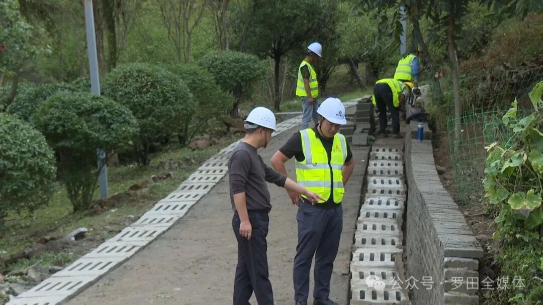 在拔云尖公园东入口,20多名施工人员争分夺秒,分散在各个点位砌筑砖石,修建排水沟和挡土墙,构筑防洪屏障。