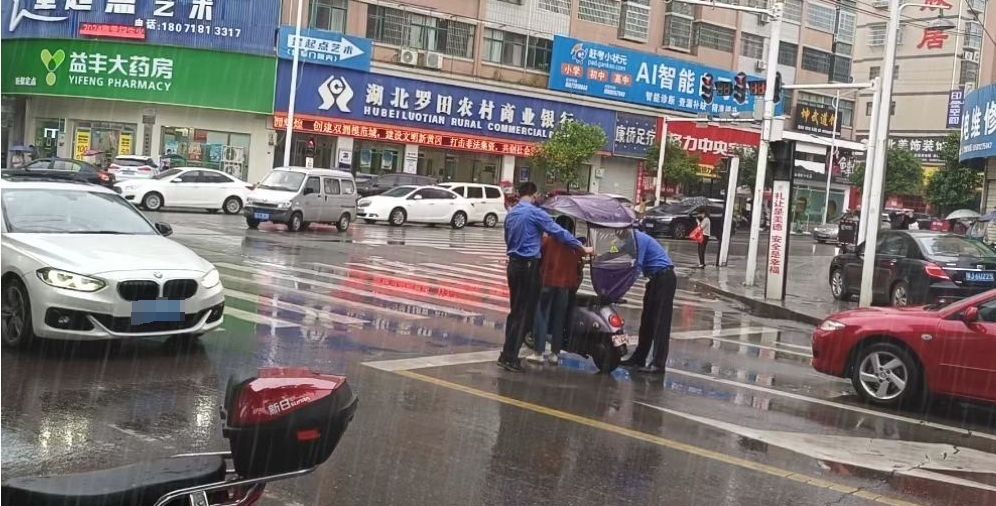 5月11日上午九点左右正值滂沱大雨,罗田城管执法大队城南中队执法队员王坦、杨涛在日常巡查至凤城三路与徐寿辉大道交叉路口时,发现一名女士连人带车侧滑倒在马路中间,来往车辆越来越多,执法队员担心会造成人员意外的伤害,便冒雨冲上前,合力帮助行人将电动车扶正。雨水浇透了队员们的制服,但市民群众的一句“谢谢”,却深深温暖了城管队员的心。