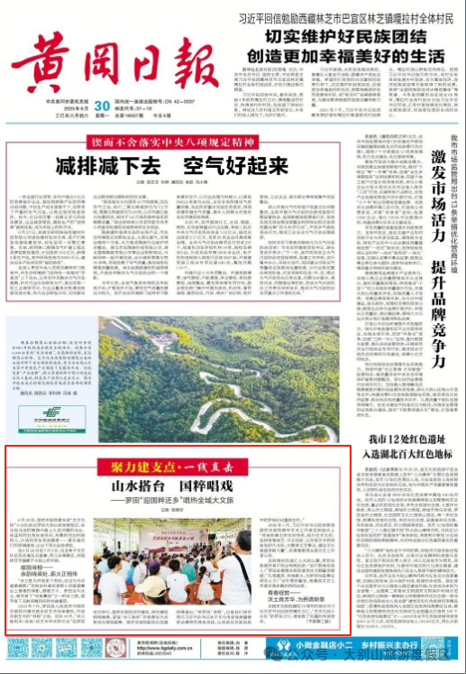《黄冈日报》6月30日头版以《山水搭台 国粹唱戏——罗田“迎国粹还乡” 唱热全域大文旅》为题,报道大别山旅游度假区文化为魂,旅游为体,以文促旅,文旅融合,助力罗田文旅高质量发展。