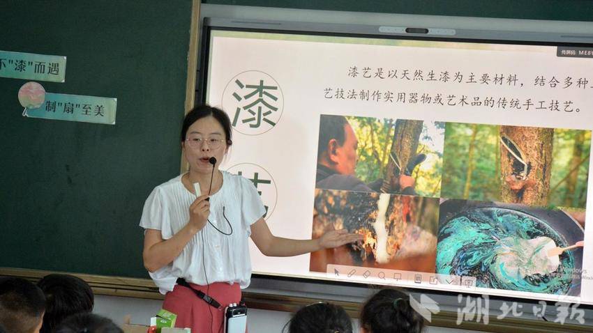 来自县实验小学的孙静老师则以《不“漆”而遇,“制扇”至美》为主题,带领学生走进传统漆艺与制扇工艺的世界。孙老师详细讲解了漆艺和制扇的工艺流程,学生们亲自动手,在扇面上绘制图案、涂抹漆料,制作出了独具特色的扇子。这堂课让学生们在实践中感受到了传统工艺的魅力,培养了孩子们的创新思维和动手能力。