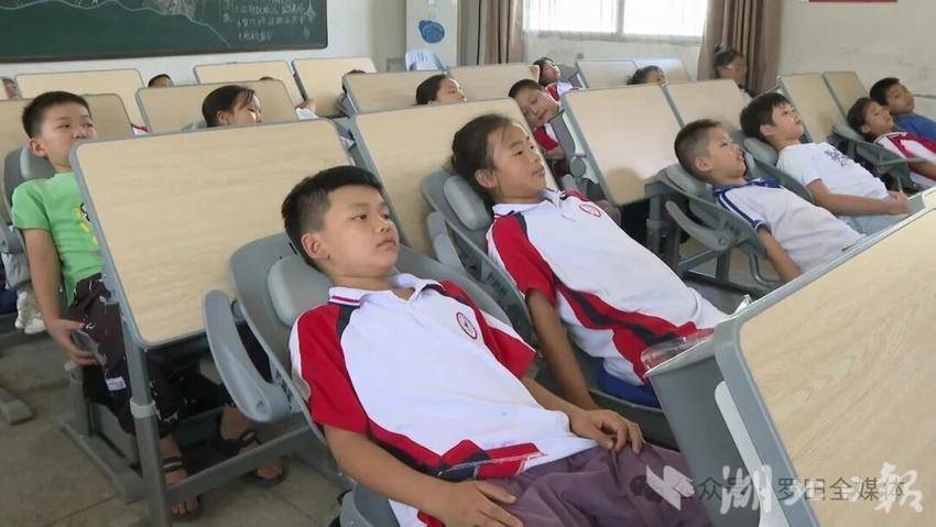 9月2日中午,在罗田县城西小学栗子坳校区五(3)班的教室内,孩子们调节好桌椅挡位,将桌面放平、椅背放倒,舒适地躺在课桌椅上休息。