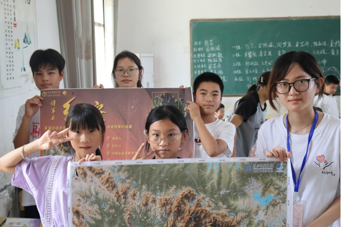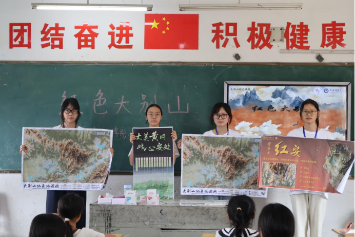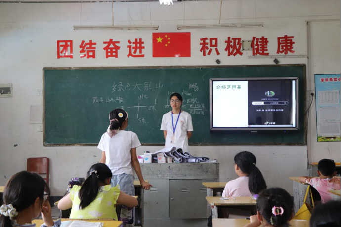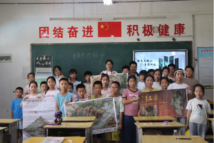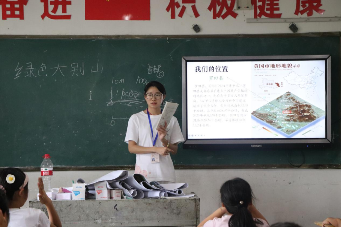 志愿者刘嘉宇则在“大别山生态”课堂上,将数字孪生地图作为核心教具。她结合PPT数字地图与实体地图,生动展示罗田县及大别山丰富的动植物、水文资源。学生们在志愿者引导下,对照分析家乡周边的生态现状与保护需求,并结合生态破坏案例与修复规划,深刻理解了保护绿水青山的重要性。这种“地图+多媒体”的互动教学,让孩子们透过屏幕“解码”大别山的生态奥秘,在心中悄然播下热爱自然、守护家园的种子。