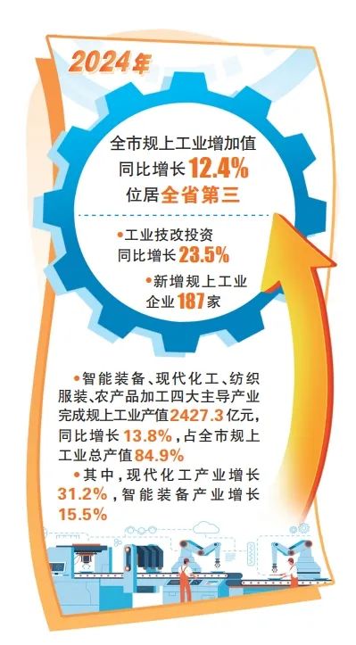 2024年,智能装备、现代化工、纺织服装、农产品加工四大主导产业完成规上工业产值2427.3亿元,同比增长13.8%,占全市规上工业总产值84.9%;其中,现代化工产业增长31.2%,智能装备产业增长15.5%。