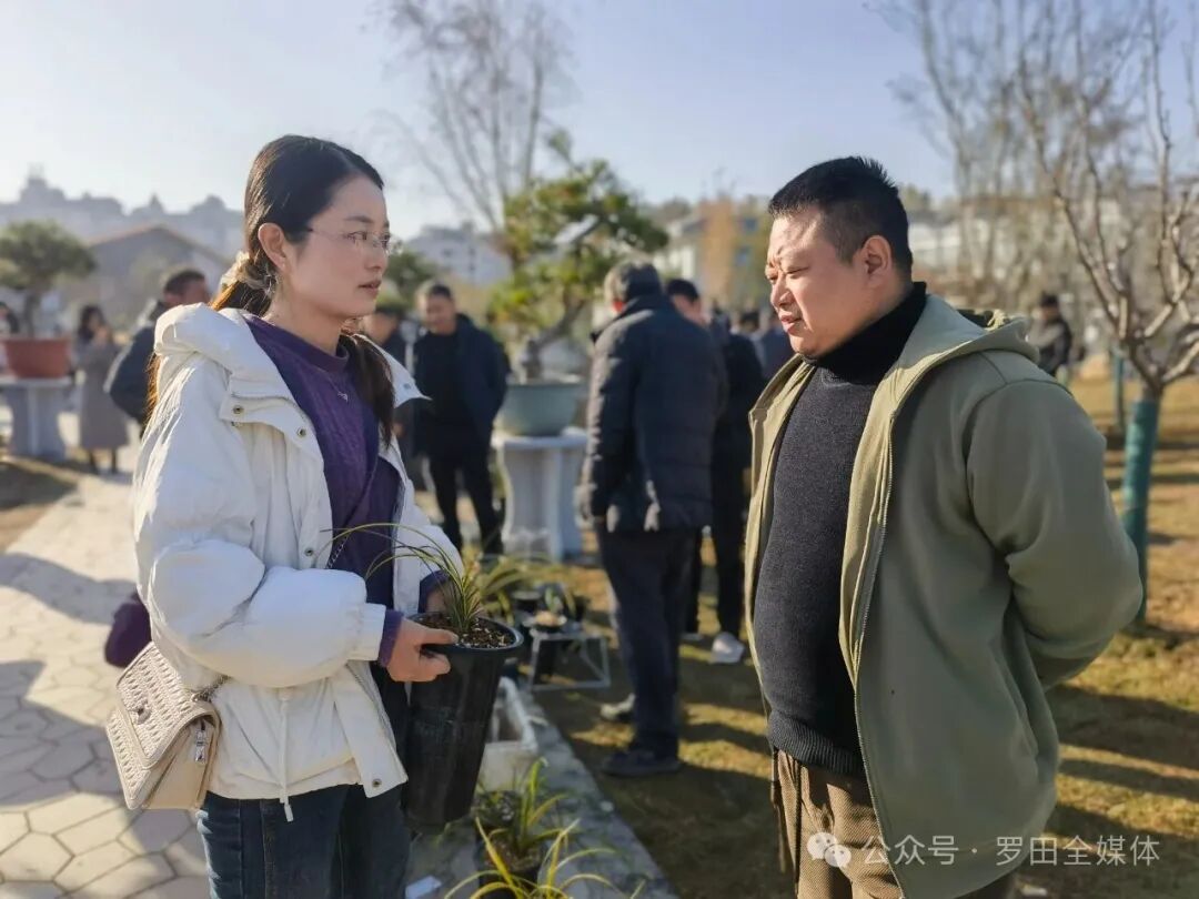 产业园中,阵阵兰香中夹杂着南腔北调的交流声。在河南信阳商人张老板的摊位前,商户正细致地向客户介绍兰花的品种特性和培育技巧,经过一番交流,交易顺利达成,买卖双方脸上都洋溢着满意的笑容。