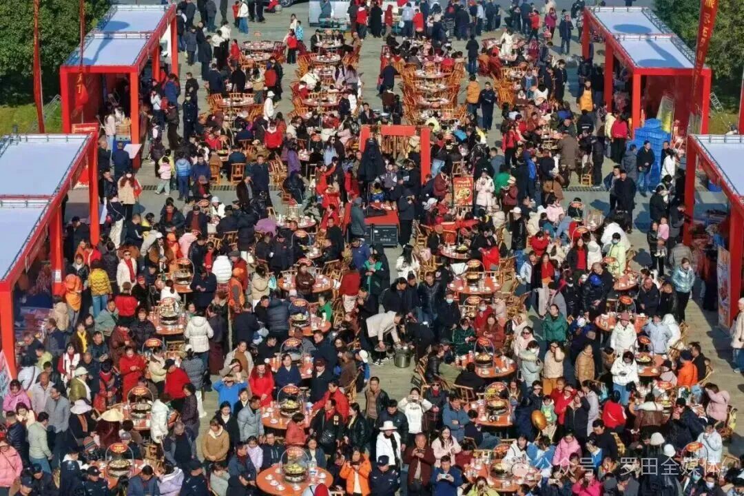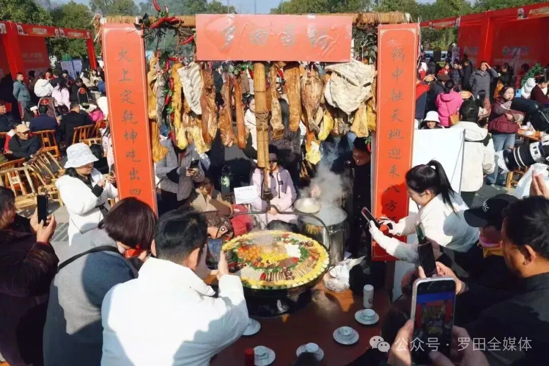 北场中心摆放着吉尼斯“天下第一吊锅”,50桌统一规格的吊锅宴整装待发,3排扯油面架子上演传统手工技艺,50壶老米酒陈列展台供人品鉴。两大会场外的烟火集市统一布局、规范管理,农特产品与年货好物琳琅满目,热闹非凡。