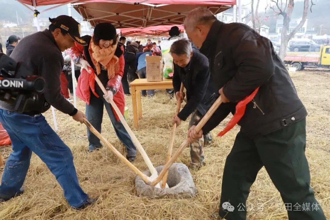 田间的民俗体验区更是烟火气十足。石臼旁,游客们轮流挥起木槌,捶打着热气腾腾的糯米,“咚咚”的声响与欢声笑语交织,软糯的糍粑在木槌与石臼的碰撞中逐渐成型,刚捶好的糍粑入口香甜软糯,满满的儿时味道。不远处的腊八粥灶台正咕嘟咕嘟地冒着热气,柴火慢熬让糯米、红枣、莲子、桂圆等食材的香气充分释放,盛上一碗趁热喝下,暖意从舌尖蔓延至心底。
