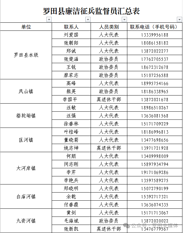 2026年征兵工作已开启,为严明兵员征集纪律规定,筑牢廉洁征兵底线,增强征兵工作透明度,自觉接受群众监督,大力推进全县征兵工作公开、公平、公正,现将罗田县及各乡镇廉洁征兵监督员名单及监督举报联系方式予以公布。欢迎社会各界对征兵工作进行监督,广大群众一旦发现有关线索,可及时拨打举报电话,一经查实将严肃查处。