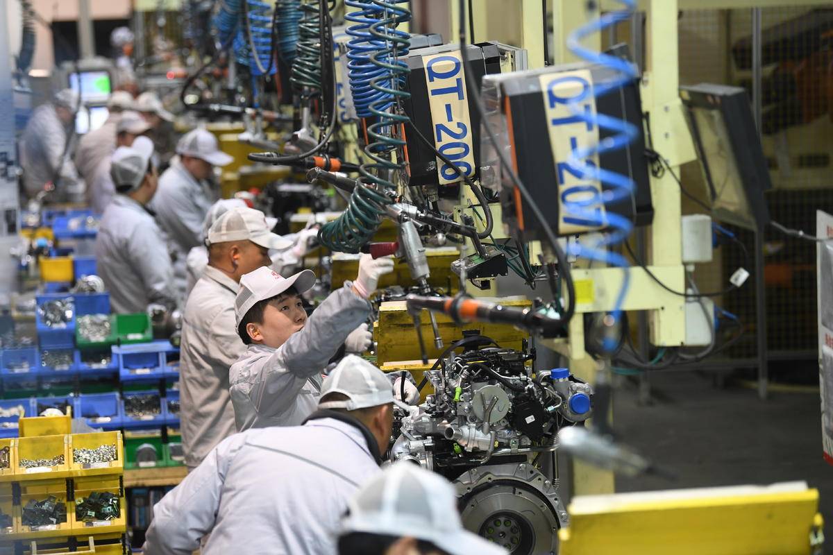 东风轻型发动机有限公司(十堰张湾)M9T混流装配线上,工人加紧赶订单。(湖北日报全媒记者田悦 通讯员冯杰 摄)