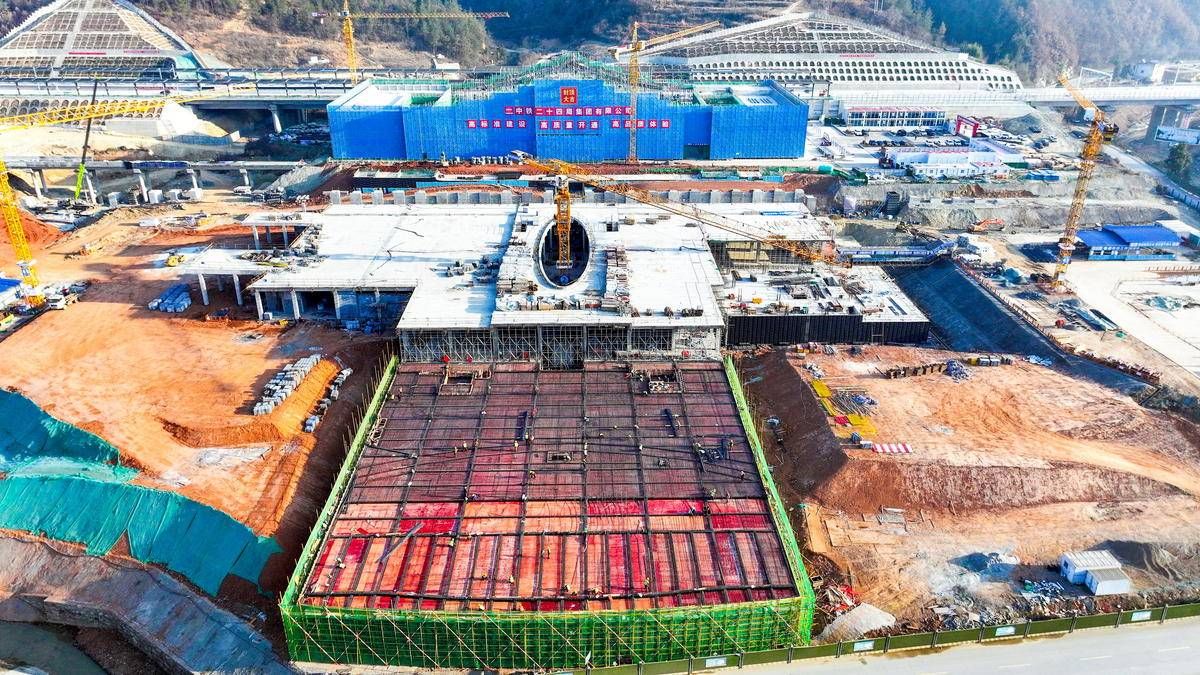 1月1日,十堰市西十高铁郧西县高铁站工地,工人们抢抓晴好天气,加紧施工,有序作业。(视界网 周家山 摄)