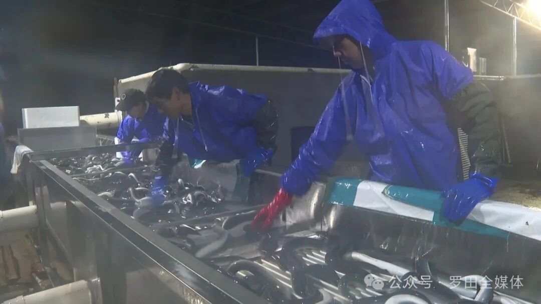 近日,在河铺镇台上冲村湖北星源生态农业有限公司的鳗鱼养殖基地,标准化养殖池内水质清澈,智能化循环养殖系统高效运转,工人们熟练地进行起捕、分拣、称重、装车等工作。