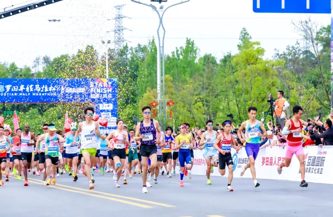 早上7点30分,湖北省田径运动管理中心主任张华,黄冈市体育事业发展中心主任余觅,罗田县委书记郝爱芳,县委副书记、县长周黎,县领导刘晓宇,互通国际体育文化集团、互通全马体育董事长邓超明共同为赛事鸣枪发令。随着清脆的发令枪响,半程马拉松、健康跑、迷你跑三个项目的选手们如离弦之箭,鱼贯而出。