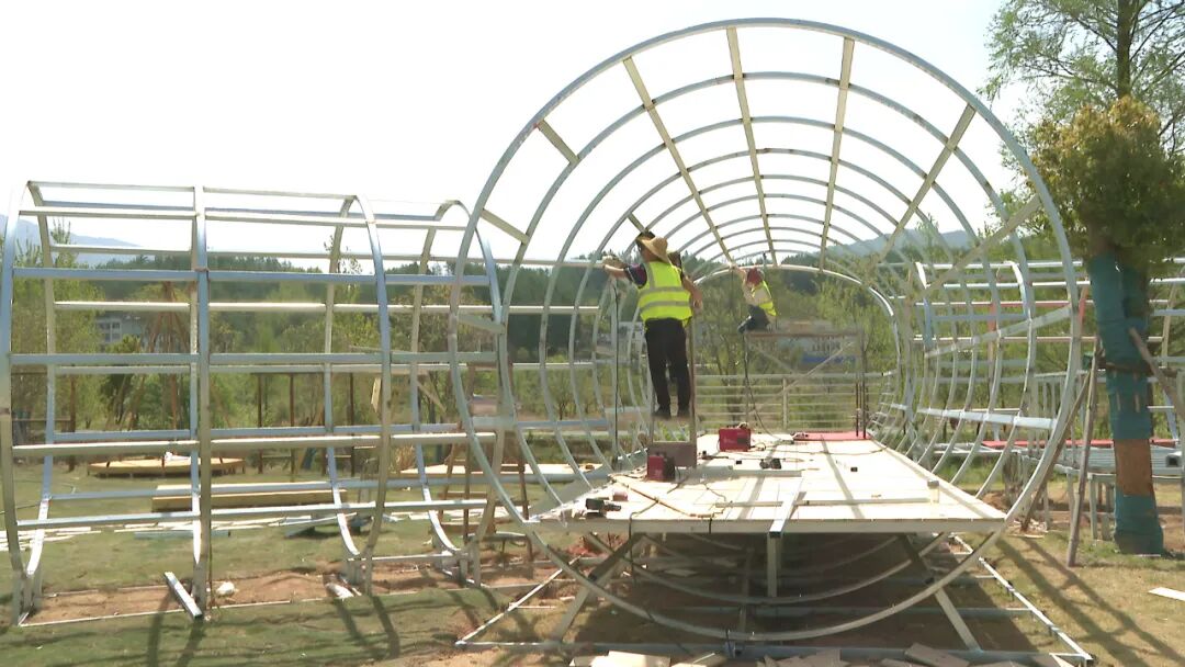 在旅游基础设施建设方面,各项目也在紧锣密鼓地进行中。在河西畈水岸花海露营基地,工人们正在进行驿站主体结构焊接;在圣人堂红叶露营基地,施工人员正在进行露营平台搭建;河西畈游客中心也正在进行植绿补绿。