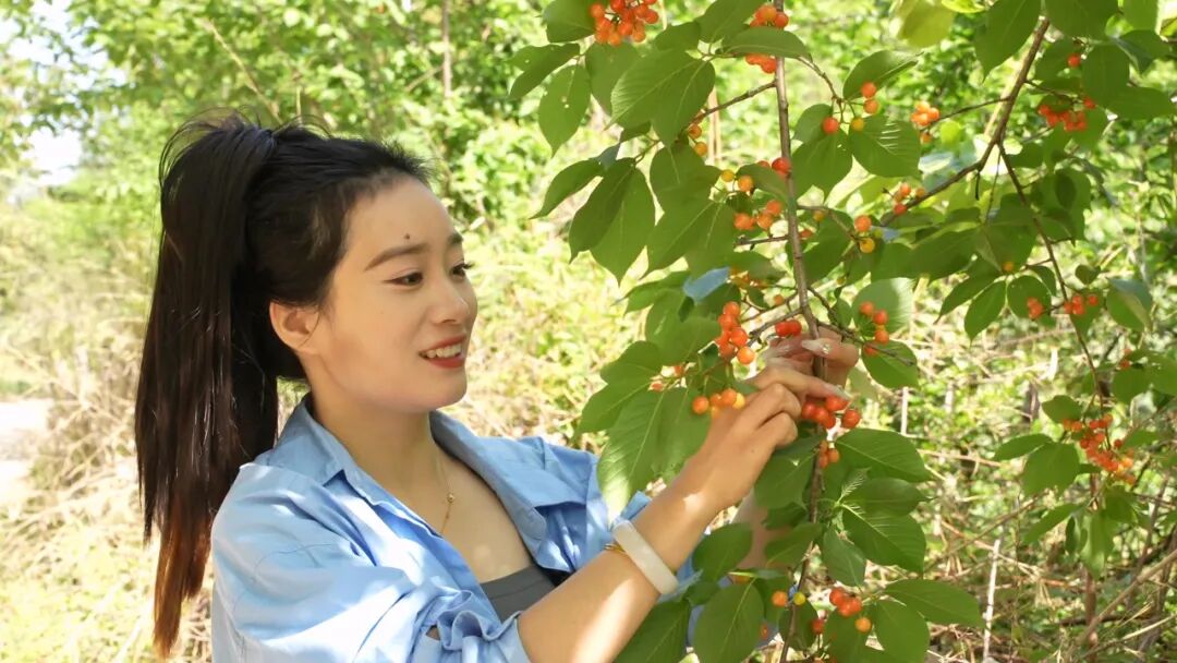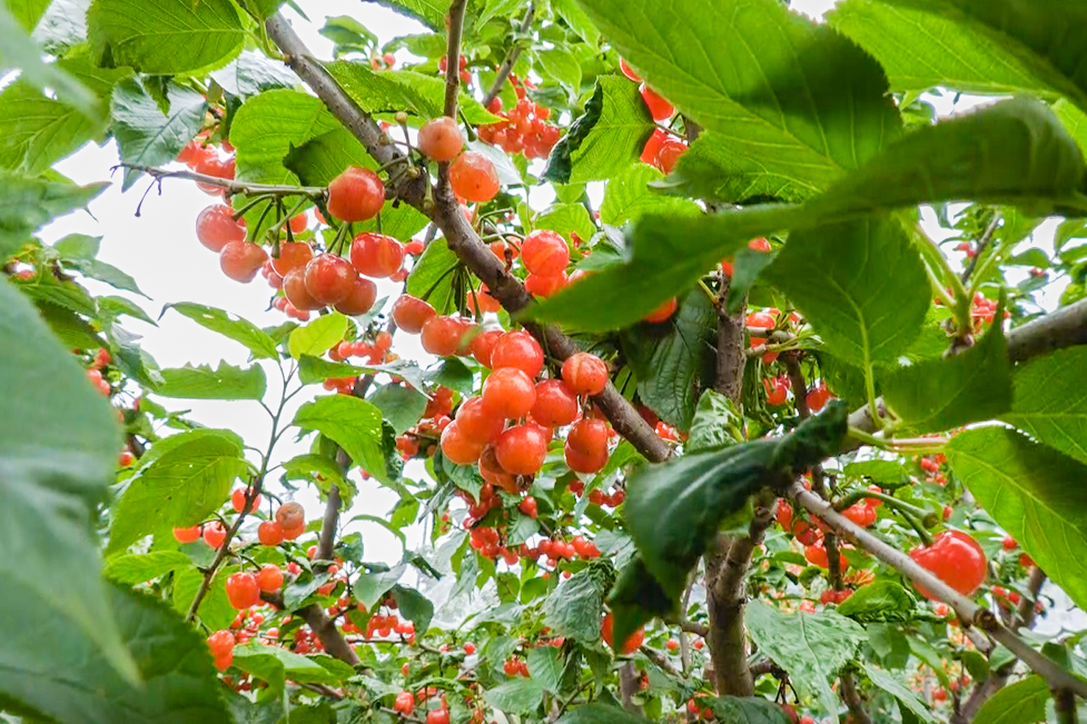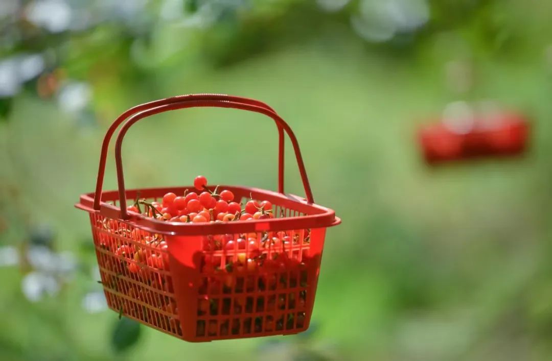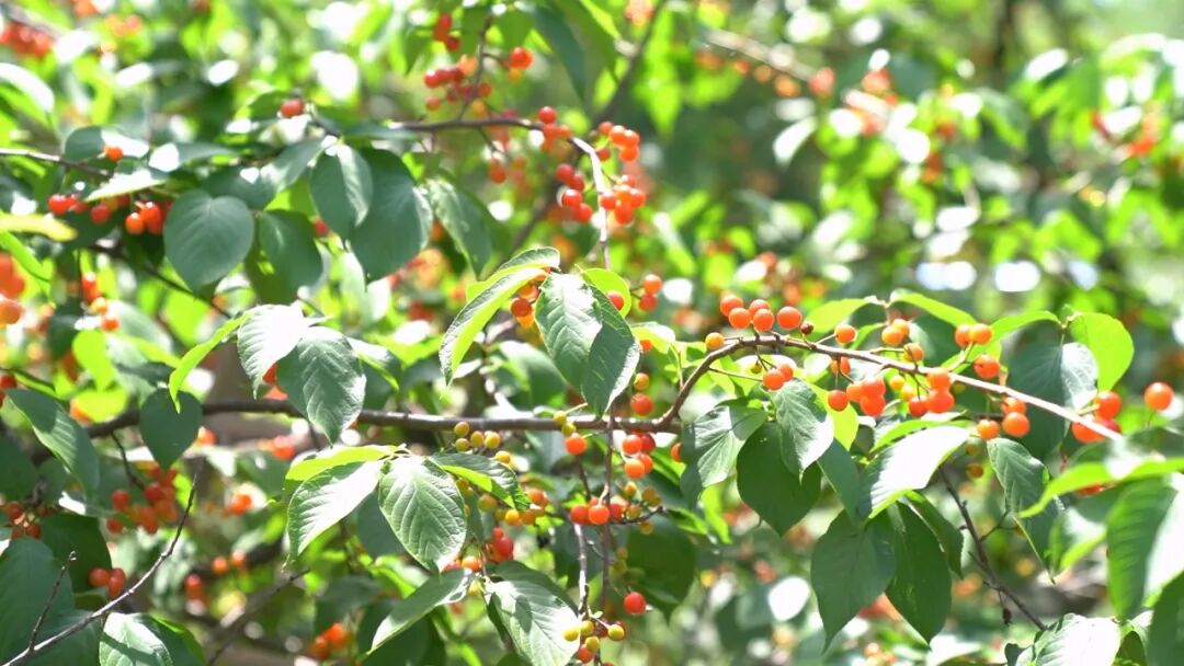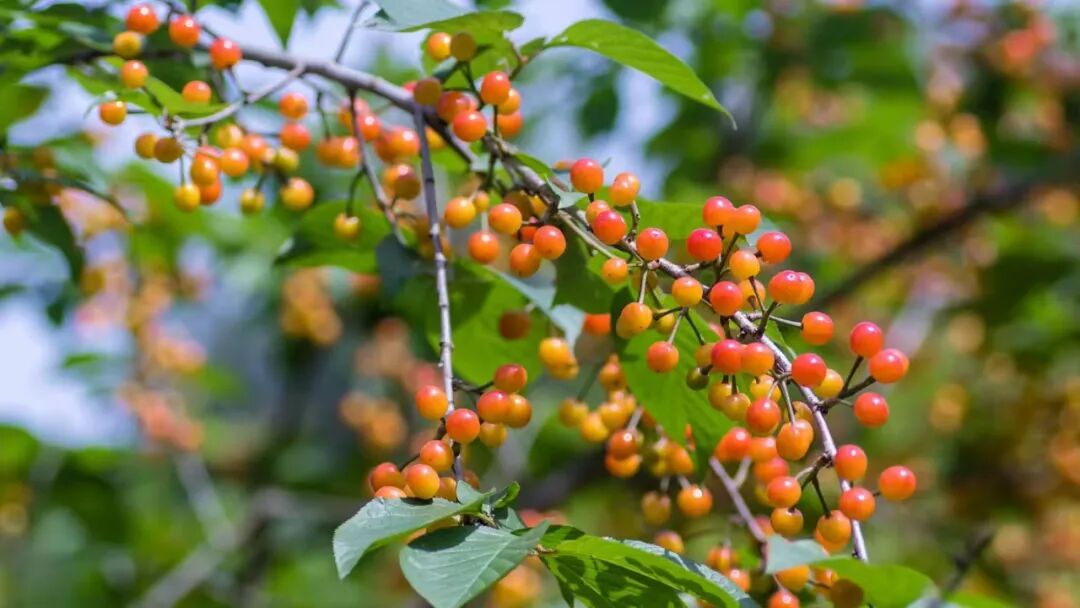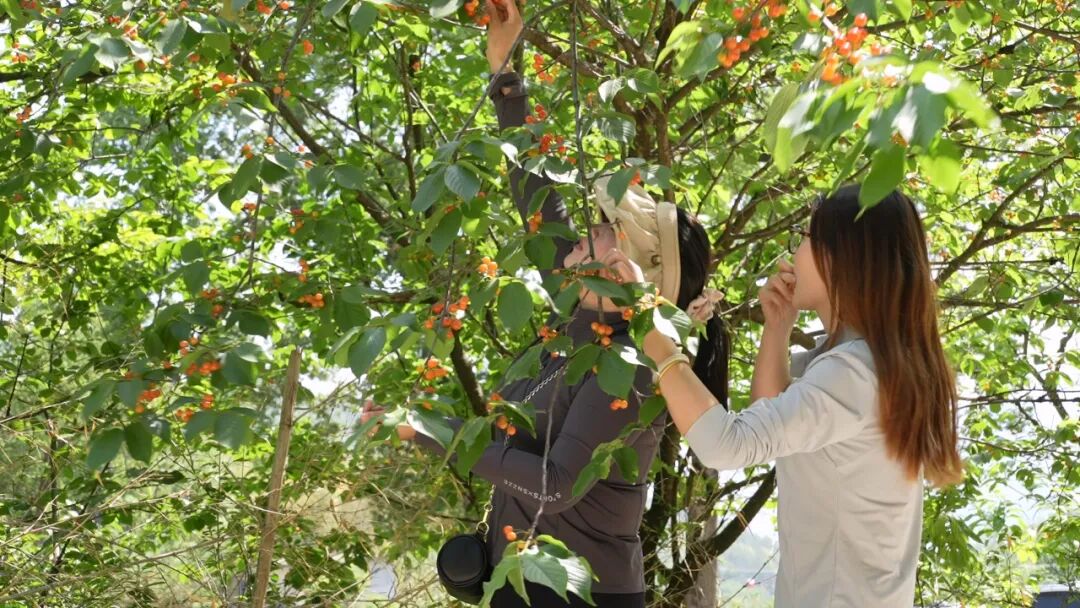 樱桃园里,一颗颗红如玛瑙、黄如琥珀的樱桃挂满枝头。游客们手提果篮,穿梭在果树之间,踮起脚尖采摘果实,欢声笑语回荡在果园里。