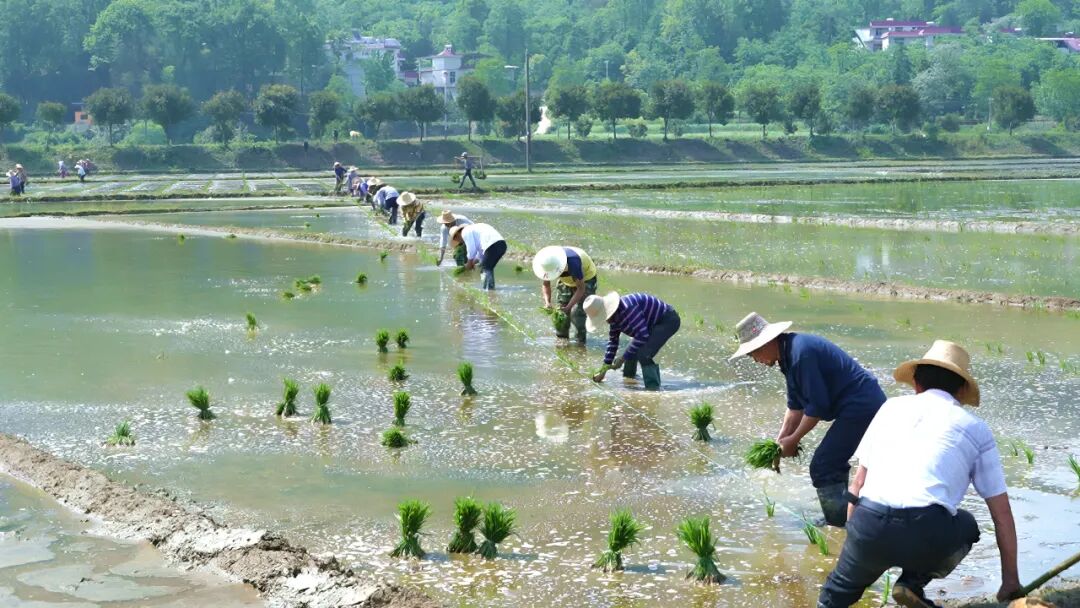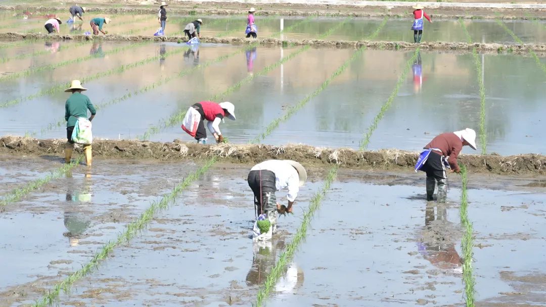4月30日,河铺镇林家咀村的水田里一大早便热闹起来。放眼望去,农户们有的在翻耕,有的在追肥,还有的在分秧,大家分工明确、动作娴熟,灵活地穿梭在田间。不一会儿,一株株青翠的秧苗便整齐有序地排列在水田中,俨然一幅流动的春耕锦缎。