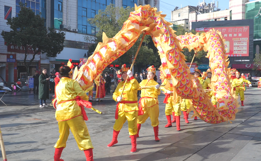 活动现场,一条条巨龙在空中翻腾起舞,气势恢宏。舞龙队员们身着鲜艳的服装,手举龙身,随着鼓点的节奏,灵活变换着各种动作。龙头高昂,龙尾摇摆,仿佛一条真正的巨龙在空中翱翔,赢得了现场观众的阵阵掌声和欢呼声。与此同时,两只色彩斑斓的醒狮也在舞台上活跃起来。它们时而憨态可掬,时而勇猛矫健,用灵动的身姿为现场观众带来吉祥与祝福。来自上海的外地媳妇周密也被罗田的这种浓厚的新年氛围所感染。