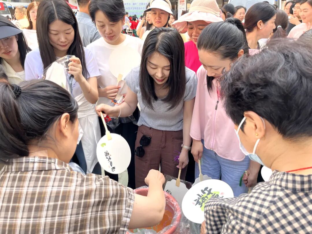 在社区趣味运动会、互动体验区,包粽子、制作漆扇、制作艾草香囊等传统活动吸引了众多居民参与。现场粽叶飘香,大家围坐在一起,互相交流包粽子的技巧,捋粽叶、填糯米、扎绳子。孩子们也在家长的带领下,积极参与-制作漆扇活动中,感受传统手工的魅力。