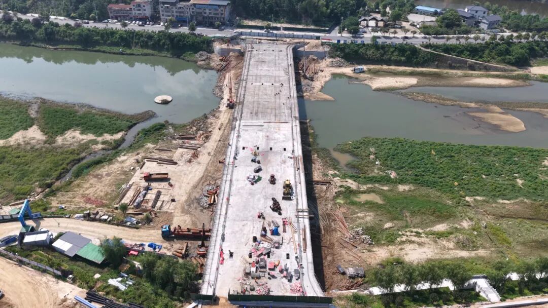 中国水利水电第八工程有限公司 崔小飞 目前进行的是桥梁的支撑排架拆除、钢管桩拆除及桥面铺装工作,后续我们将完成剩余该工程桥梁护栏及人行道施工,义水南路北路道路工程及机电与绿化施工工作。
