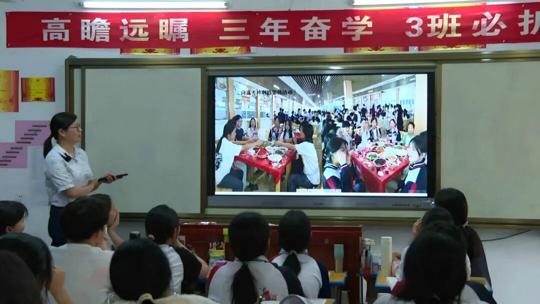 早在几周前,周兰老师就将同学们三年的成长瞬间制成PPT,教室里的奋笔疾书、运动场上的奋勇拼搏等画面被一一呈现,勾起大家对高中生活的美好回忆。