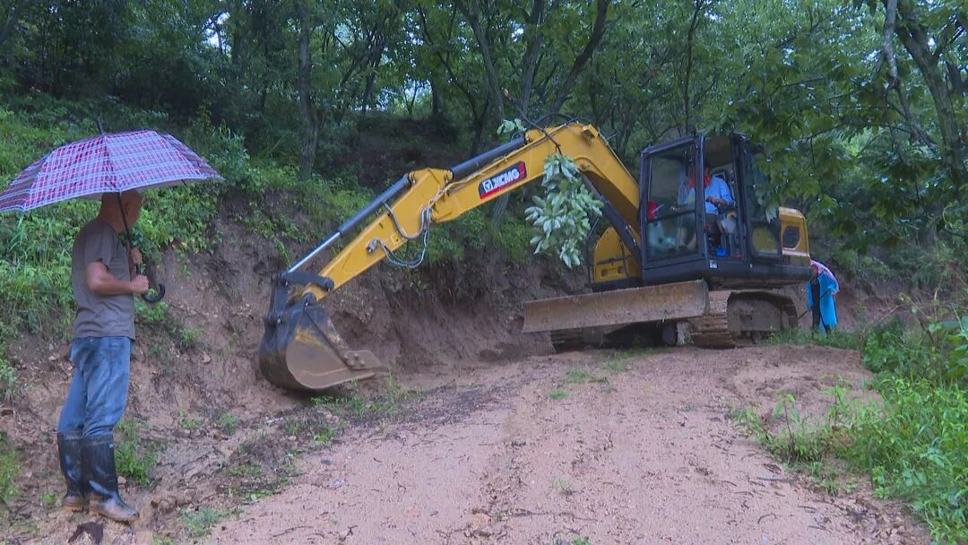 6月21日,在三里畈镇茶林冲村三组的后山上,村两委干部正组织挖掘机和村民一起清理山路沟渠,确保雨水及时排出,防止雨水堆积冲毁路面。