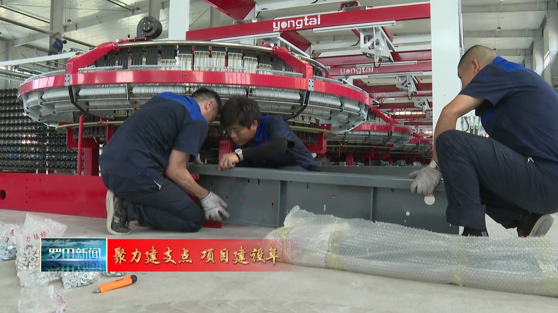 7月1日,在胜利镇洛家畈村湖北省宝耒塑料制品有限公司韩塔寺集装袋生产项目建设现场,技术人员正忙着组装大型生产设备,测量定点、调整位置、装配螺丝,现场一片火热的生产调试场景。