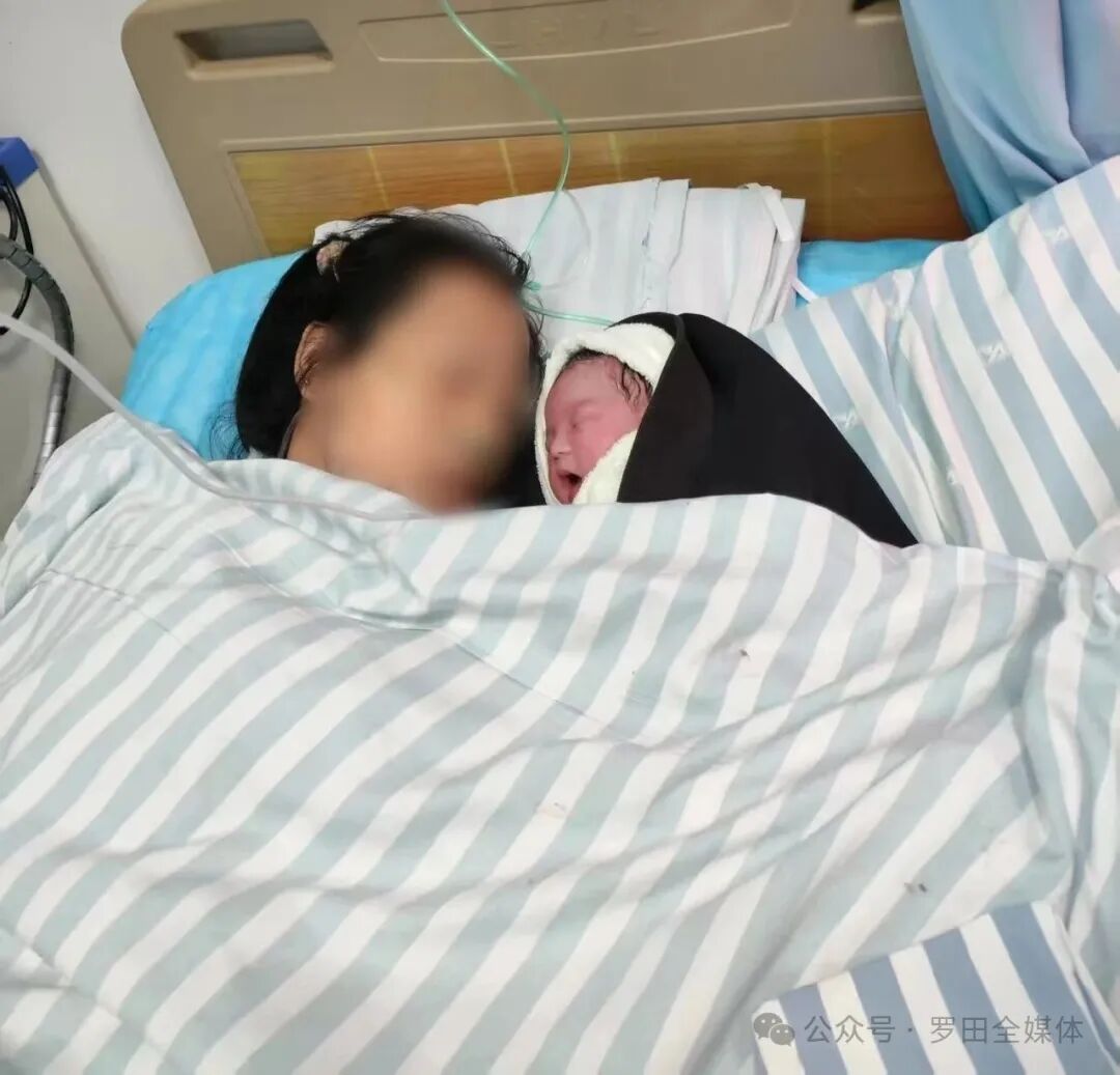危急时刻,涂远盼当机立断:“就地接生!启动孕产妇急救预案!”他屈膝跪在车厢地板上,专注操作,全力守护两条生命。