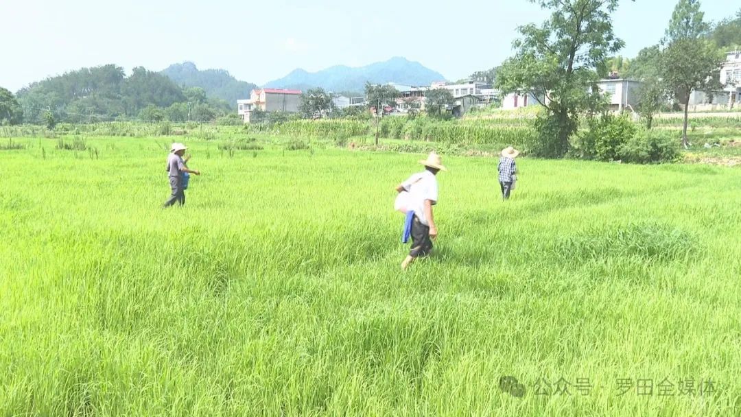 7月18日,在罗田县三里畈镇七道河村广源农机服务专业合作社的稻田里,种植大户正组织务工群众在田间施肥。