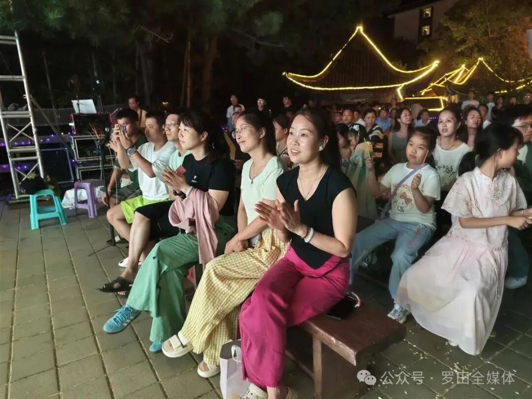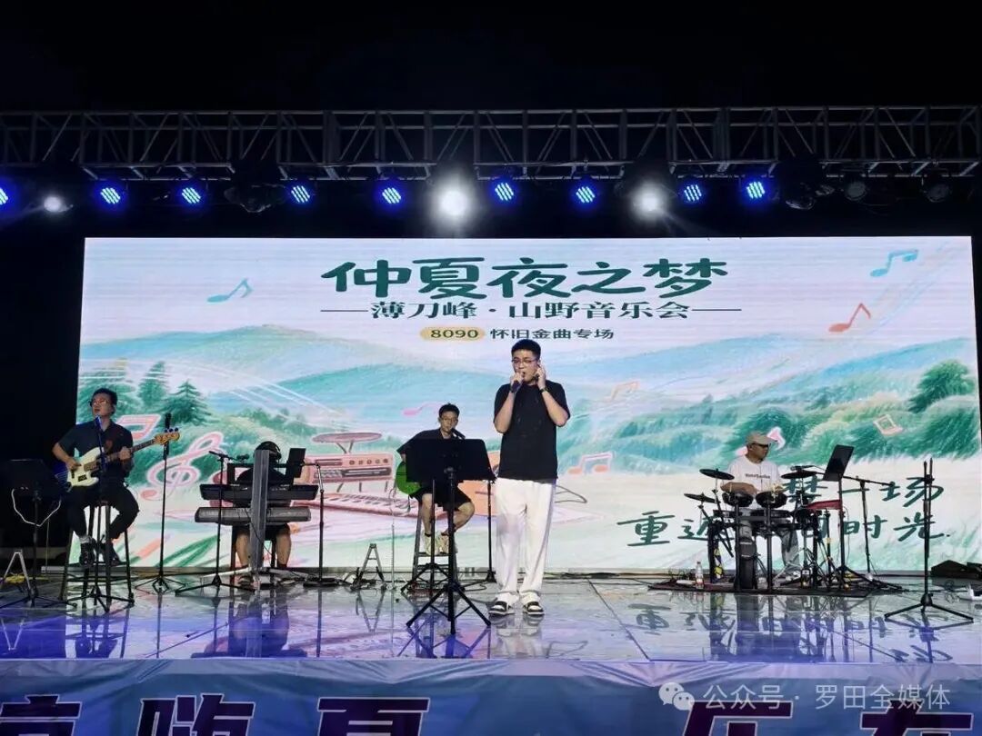 傍晚七点,吹着清凉的晚风,罗田薄刀峰度假酒店旁的小广场上,一场由本地乐队献唱、以“乐见山野”为主题的经典音乐演唱会拉开帷幕。《童年》《后来》等一首首承载着回忆的老歌轮番上演,游客们挤坐在竹床上,挥舞着荧光棒,有人跟着旋律哼唱,有人伴着音乐起舞。晚风裹挟着歌声与欢笑,台上台下其乐融融。