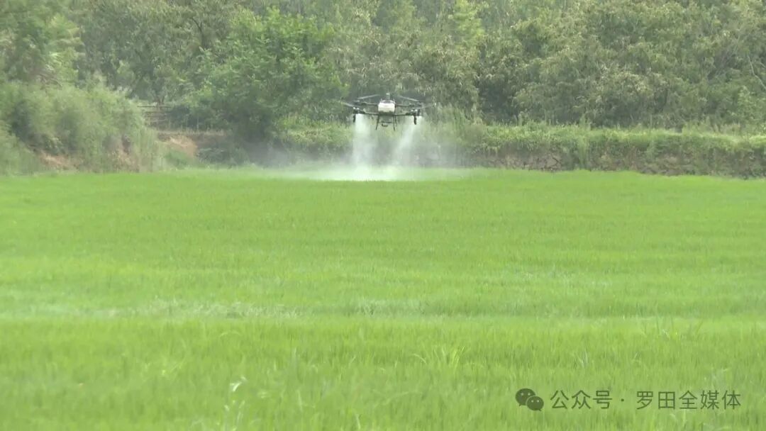 三里畈镇任鹏农机专业服务合作社理事长 张平 利用无人机进行病虫害的防治,喷洒磷酸二氢钾,对水稻抗旱起到了一定的作用,保证粮食稳产增收。
