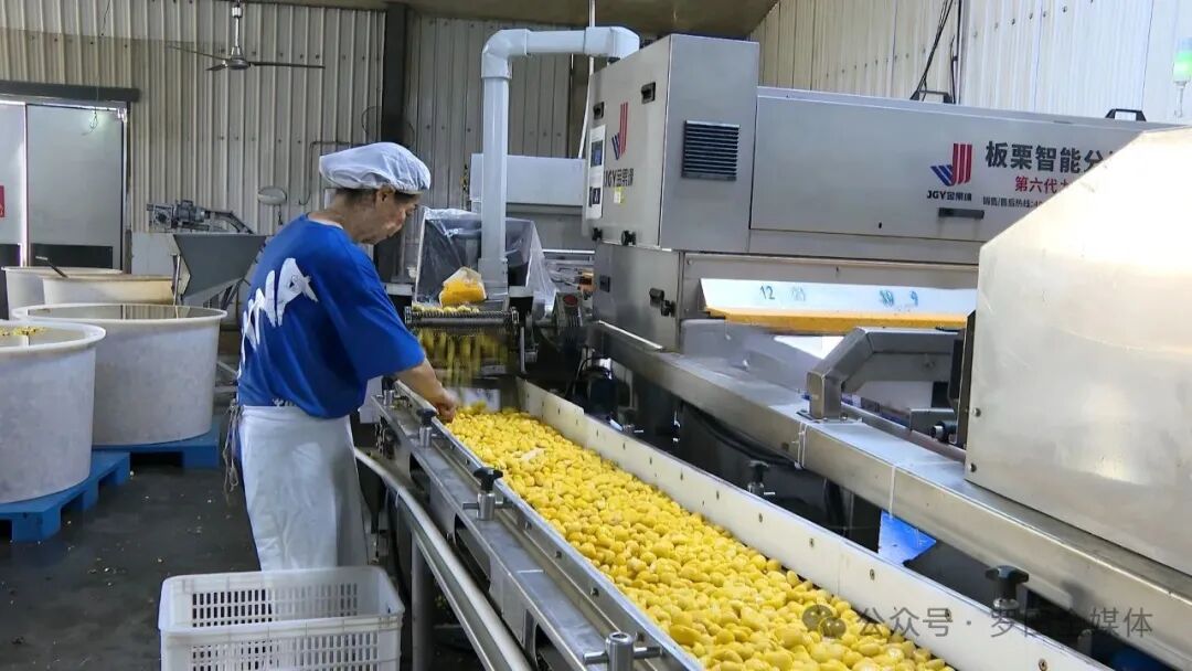 8月25日,湖北益佳食品有限公司的生产车间里一片忙碌景象。工人们有条不紊地进行剥壳、清洗、漂烫、速冻、挑选、包装等工序,一颗颗金黄饱满的板栗经过精细加工后,被有序送入库房。