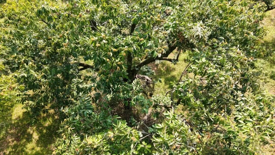 这棵“板栗树王”与周边板栗树相比,主干粗壮,得需数人合抱,灰褐色的树皮粗糙如老茧,纹路纵横交错;繁茂的枝叶交织成一片巨大的绿荫;枝头挂满了饱满的板栗球,沉甸甸地满是丰收的景象。