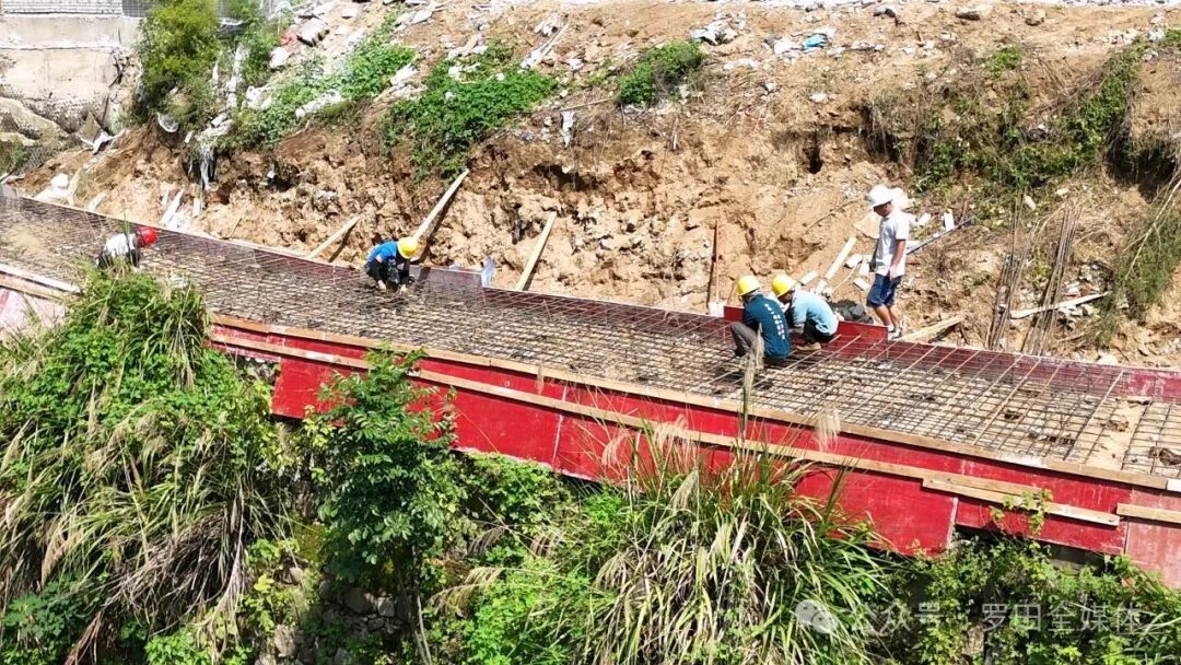 在九资河镇九资河村农村基础设施建设项目现场,施工人员抢抓晴好天气搭建模板、捆扎钢筋,准备浇筑河边挡土墙,镇村干部和市场主体现场督导进度。