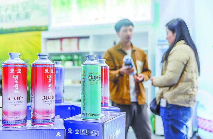 鹤峰展馆内,工作人员向顾客介绍鹤峰硒茶精酿啤酒。