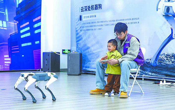 小朋友在工作人员指导下,与云深处机器狗互动。