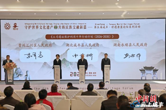 开幕式上,发布了《唐崖土司城址考古发掘报告》及中国土司遗址文物主题游径;湖北咸丰、湖南永顺、贵州汇川三地共同签署《土司遗址保护利用十年行动计划(2026-2035)》。随后,与会专家、学者围绕“土司文化与民族交往交流交融”“文化遗产保护利用与文旅产业高质量发展”两大主题展开深度研讨。