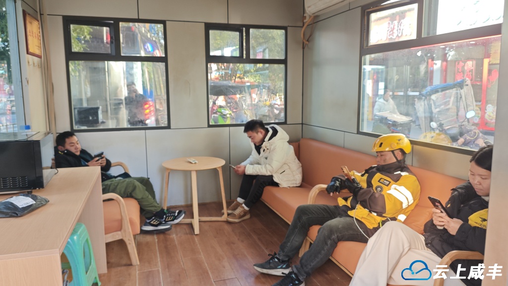 本网讯(通讯员雷玖一、陈礼伟、陈春)11月21日,县城皇城广场附近新改造升级的暖“新”驿站里,几名外卖骑手正趁着接单间隙歇脚充电。