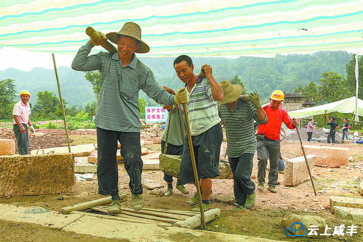 2015年7月5日,非遗项目唐崖石刻省级代表性传承人谢先华(右)指导工人将世界文化遗产标识镌刻在唐崖土司城遗址文化墙上。