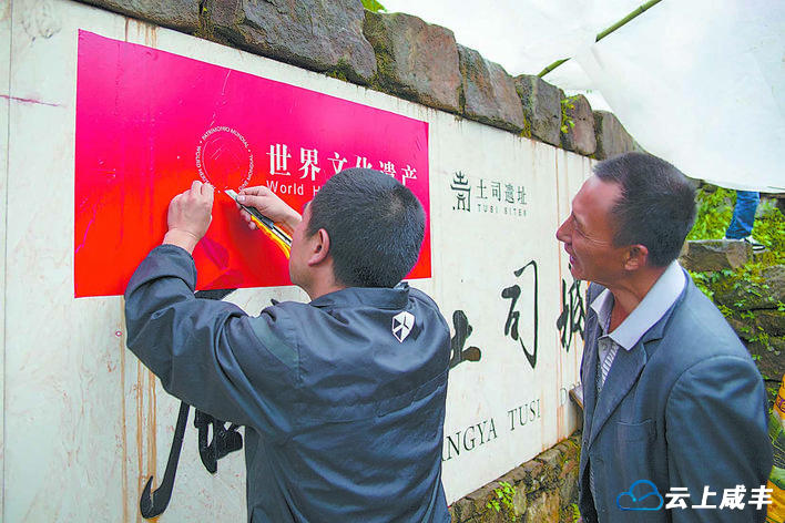 9年前,2015年7月4日,咸丰唐崖土司城址正式列入世界文化遗产名录,唐崖遗址管理处工作人员与当地干群一起,载歌载舞,欢呼祝贺;申遗成功的第二天,也就是7月5日,非遗项目唐崖石刻省级代表性传承人谢先华与同事一起将“世界文化遗产”的标识镌刻在唐崖土司城的招牌上。