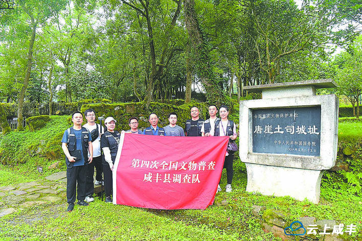 2024年7月5日,第四次全国文物普查咸丰县调查队工作人员走进唐崖土司城址,在文物保护标志碑前合影留念。