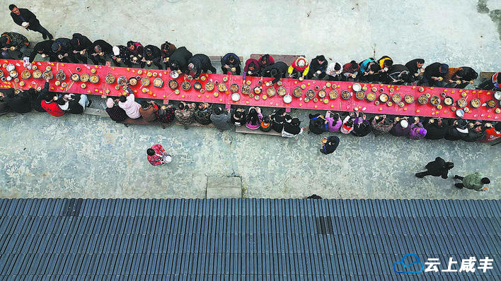 咸丰县小村乡李子溪村张家界院落村民共吃长桌宴,迎接元宵节。(全媒体记者李维君 通讯员陈伦超 摄)