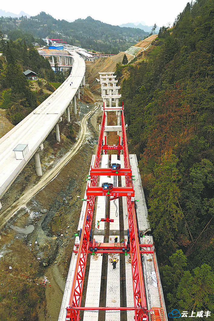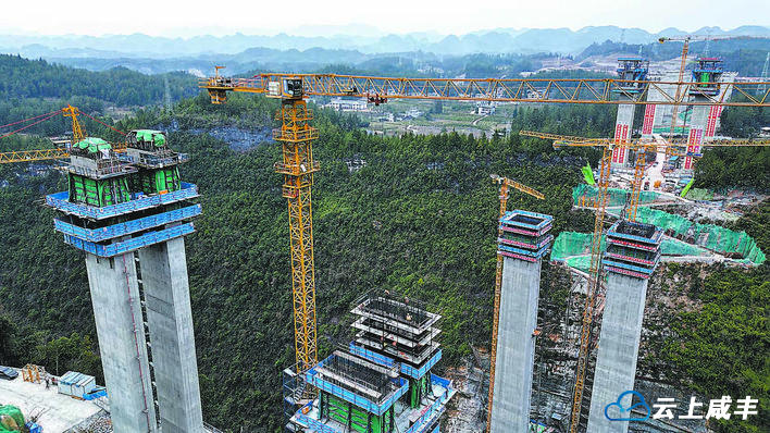 中国葛洲坝路桥工程有限公司的建设者在利咸高速大河特大桥建设工地劳作。(全媒体记者李维君 摄)