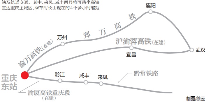 重庆东站是集高铁、轨道、公交、商业于一体的超级枢纽,对助推加速成渝地区双城经济圈与西部陆海新通道、长江经济带的战略协同具有重要意义。据介绍,该站将引入渝厦、渝万、渝贵等多条高铁及轨道交通。其中,来凤、咸丰两县将可乘坐高铁直达重庆主城区,乘车时长由现在的4个多小时缩短至1个多小时。届时,来凤、咸丰两县将实现高铁直达重庆主城区的时代,同时结束与厦门等东南沿海城市不通火车的历史。郑万高铁衔接渝万高铁引入重庆东站,形成京郑渝和沿江通道,届时武汉有望3小时直达重庆。