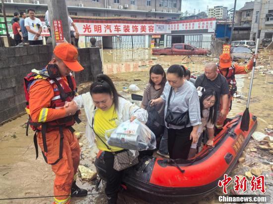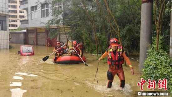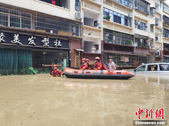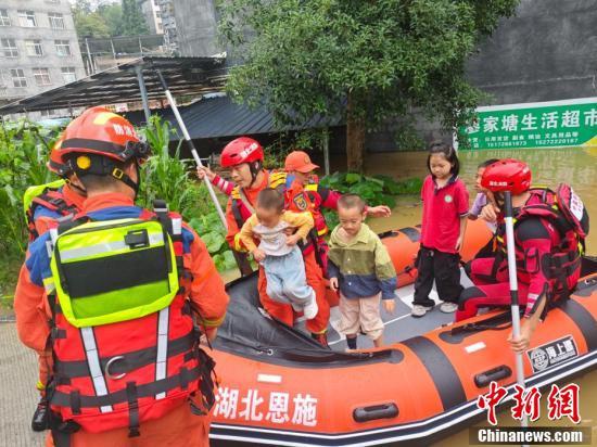 6月30日晚至7月1日,湖北省咸丰县遭遇暴雨袭击,12小时降雨量突破300毫米,刷新当地单日降雨极值。受强降雨影响,咸丰县城出现内涝。消防救援部门迅速响应,调派125名消防救援人员,出动22台消防车、11艘舟艇,携带救援绳、救生衣等抗洪抢险救援装备,赶赴高乐山镇、曲江镇等地进行救援。截至7月1日中午12时,消防、公安等救援力量已紧急转移受灾群众1.8万余人。图为消防救援人员紧急转移受灾群众。