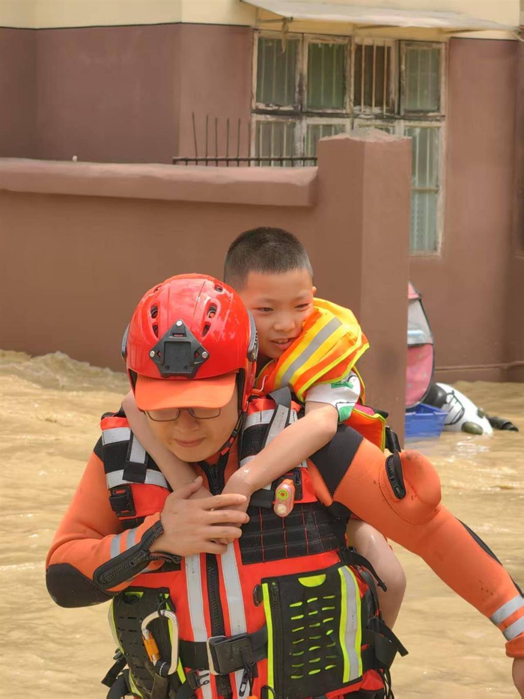 消防救援人员正在转移群众。(通讯员 牟军 摄)