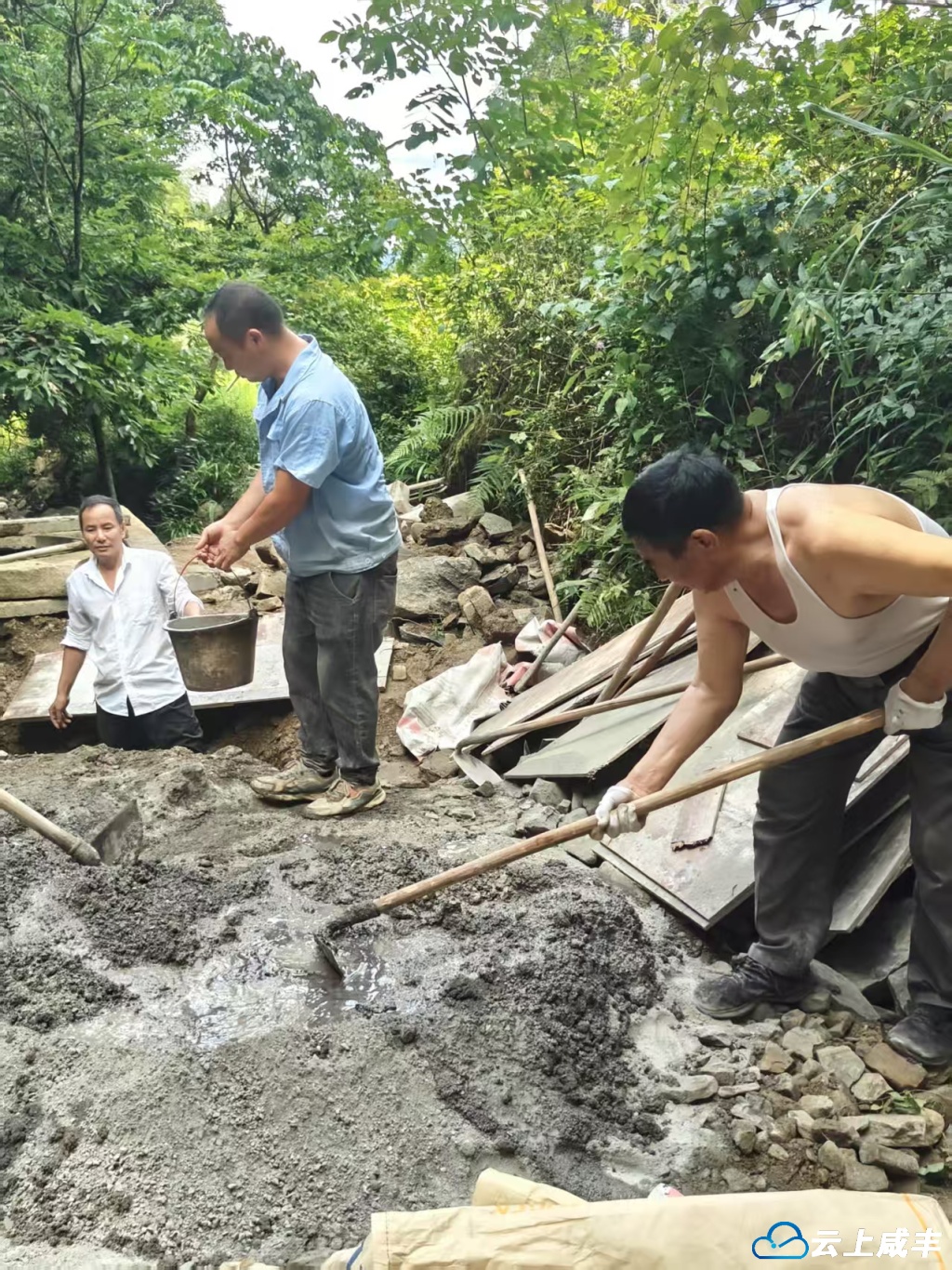 该蓄水池供村集镇100余户300人日常用水,因暴雨损毁后,村“两委”、驻村工作队员迅速组织抢修,乡人大主席团现场指导,村民合力筹措水泥15袋、沙土2立方米,仅4天便完成修复。