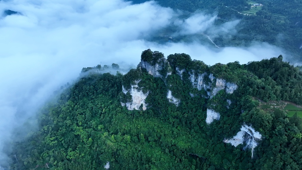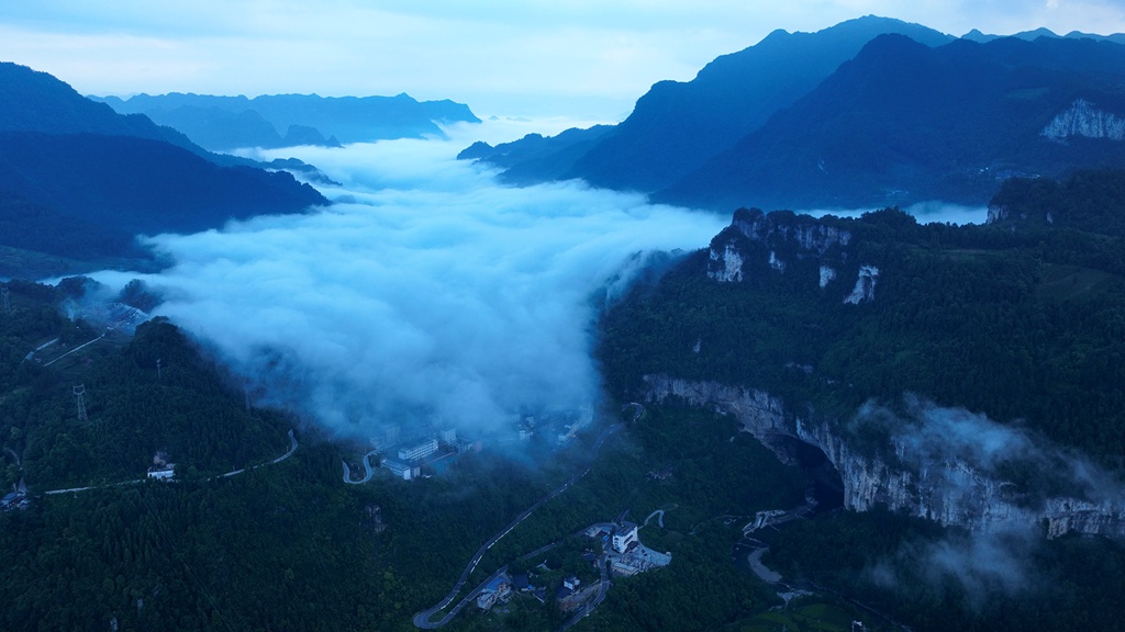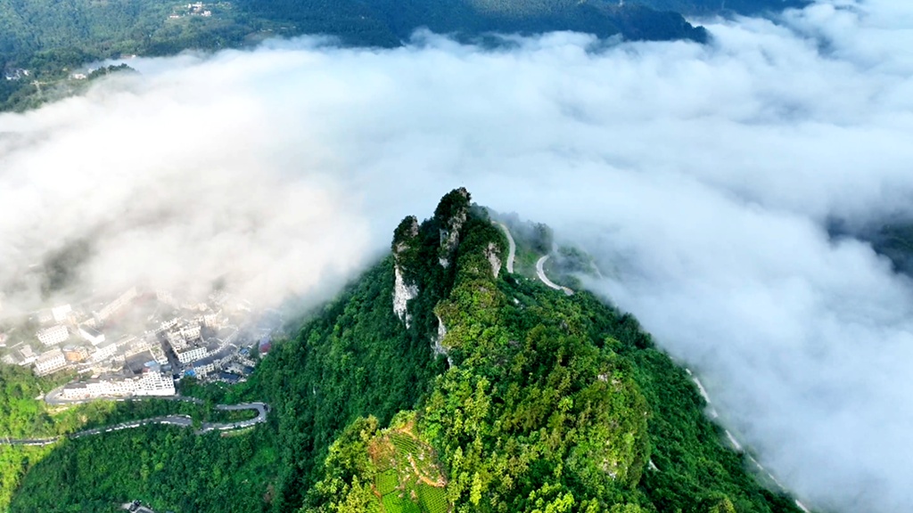 咸丰县黄金洞乡的夏日清晨,被一层轻若蝉翼的纱幔轻轻覆盖,鳞次栉比的屋舍、层叠起伏的群山、蜿蜒盘旋的公路在雾海中若隐若现,恍若仙境。