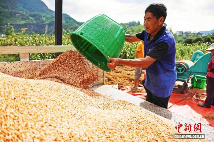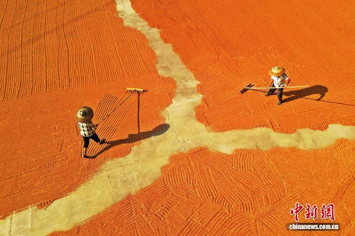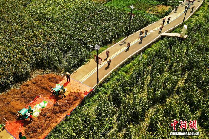 近日,湖北省咸丰县大路坝区500多亩集中连片的高粱进入收获季,当地村民利用晴好天气抢收抢晒,确保颗粒归仓。咸丰县地处鄂渝交界处,近年来,当地采取粮油轮作的方式,发展高效农业,带动农旅融合,助力乡村振兴。图为村民在翻晒新收的高粱。李维君 摄