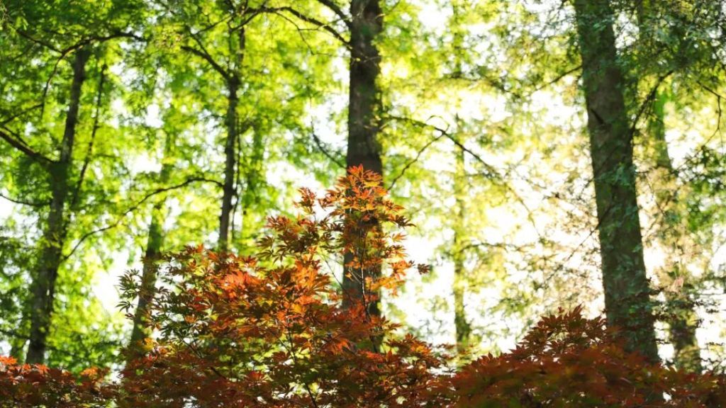 沿步道缓缓前行,脚下是落叶铺就的“软毯”,头顶是枝叶织成的“绿棚”,阳光透过叶隙洒下斑驳碎金,耳畔既有溪水流淌的潺潺声,又有飞鸟清脆的鸣啼,偶见一只松鼠抱着松果从树干窜过,恍惚间竟像闯入了童年的童话书。
