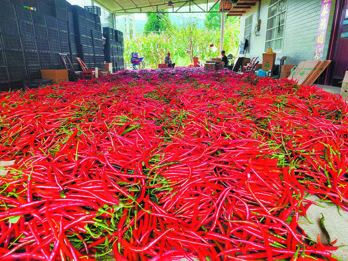 9月8日,建始县业州镇苏家坪村的辣椒丰收,菜农正忙着将饱满红艳的辣椒分拣装筐。(通讯员 孙国林 曹洪菊 摄)