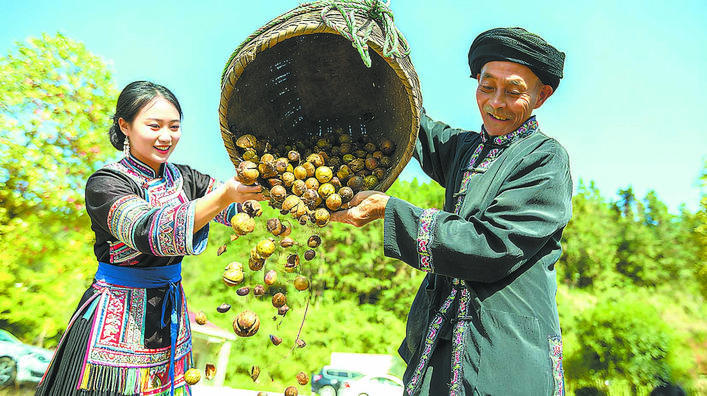 白露之后,来凤县百福司镇兴安村漫山遍野的油茶果飘香,村民正在采收油茶果。(通讯员 张 杏 摄)